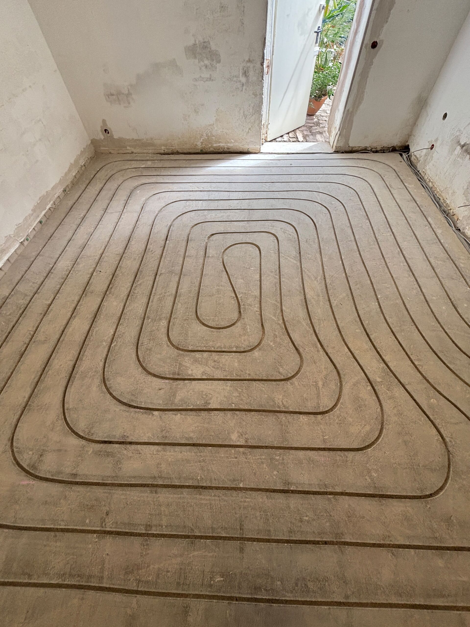 Beim nachträglichen Einbau einer Fußbodenheizung fräsen wir gezielt Kanäle in den bestehenden Estrich, in die später die Heizrohre eingelegt werden. Das Verfahren ermöglicht es, eine Fußbodenheizung in Ihrem Zuhause zu installieren, ohne den Estrich aufwendig herauszureißen oder neu aufzubauen.