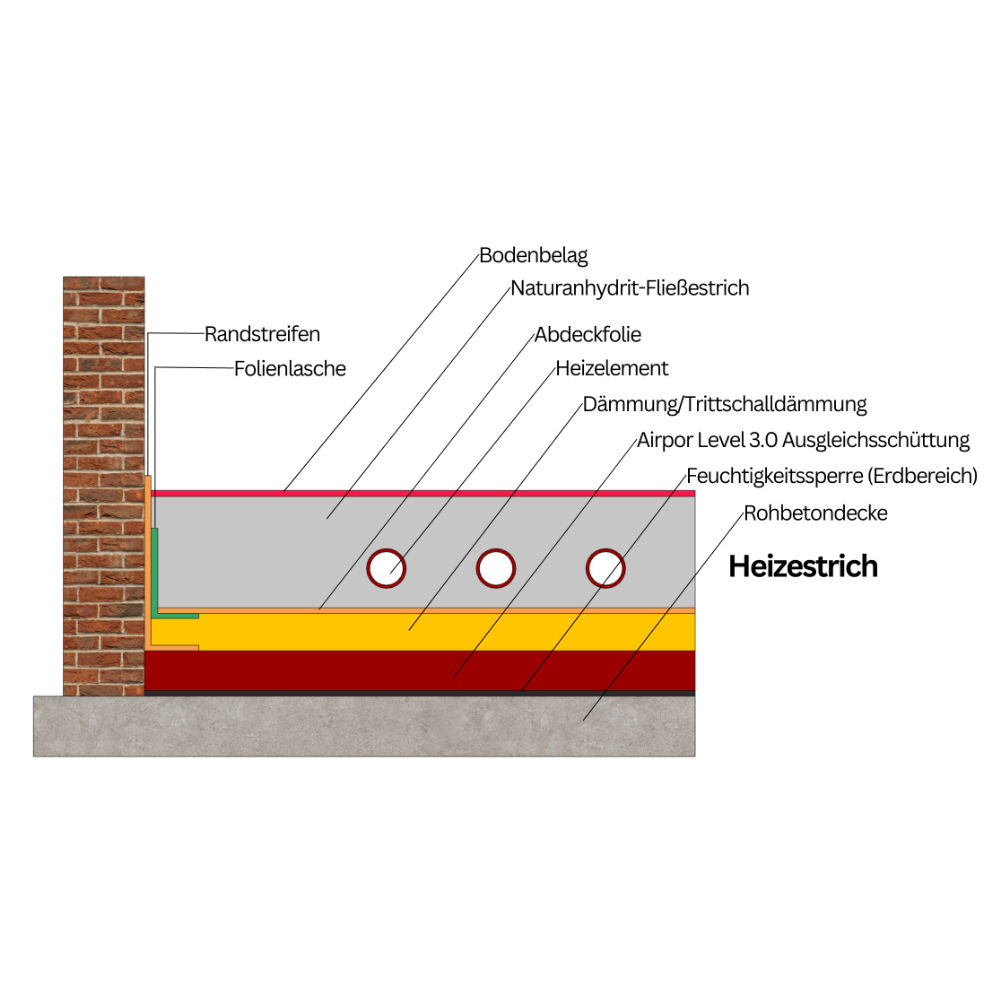 Der Estrich liegt auf einer Dämmschicht versehen mit einer Trennlage (z.B. Rasterfolie), welche ca. 10 cm überlappt und verklebt wird. Darauf werden Heizrohre mit Klammern befestigt in einem Abstand von ca. 40 – 50 cm, sodass die Rohre dicht auf der Trennlage liegen (z.B. Noppen System). Die Trennlage wird mit der Folienlasche der Randstreifen verklebt.